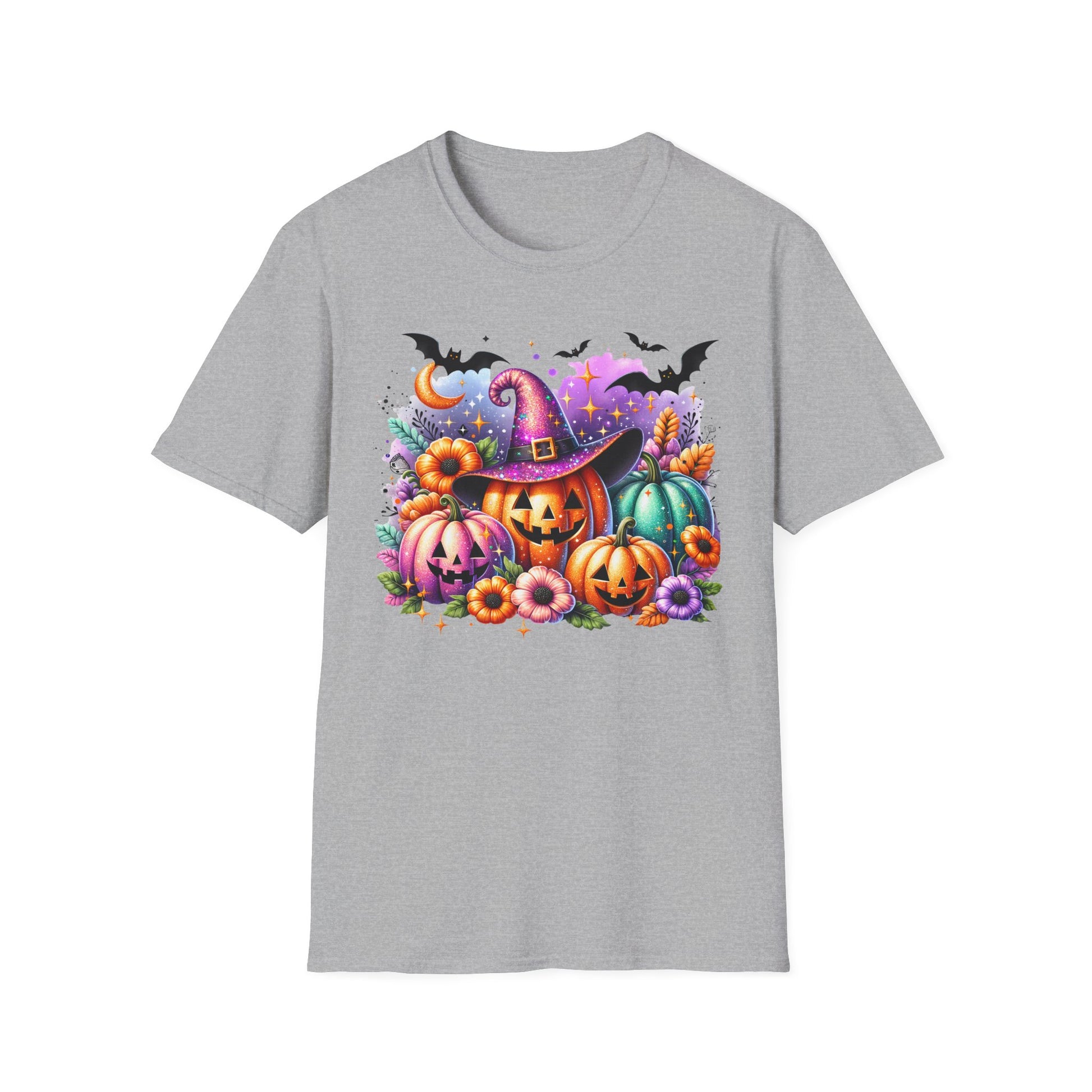 Embrace the spirit of the season with this charming Unisex Softstyle T-Shirt, perfect for those who love celebrating Halloween! Featuring a vibrant design of festive pumpkins and playful bats, this tee brings a delightful touch to your autumn wardrobe.