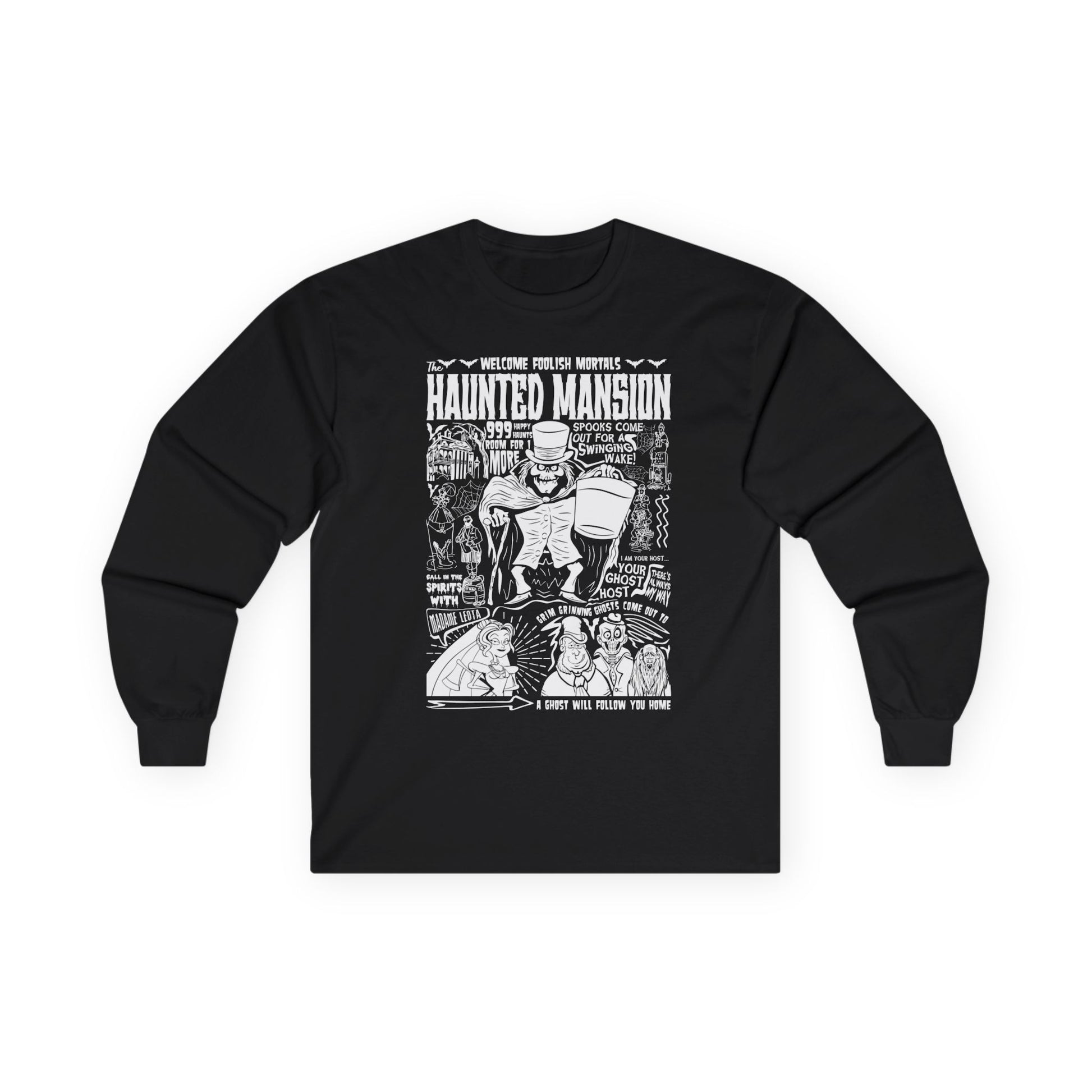 Haunted Mansion Long Sleeve Tee designed for those who love all things spooky. This Halloween-themed, gothic-inspired shirt is a fun unisex graphic tee and makes an ideal gift for fans of eerie vibes and ghostly adventures.